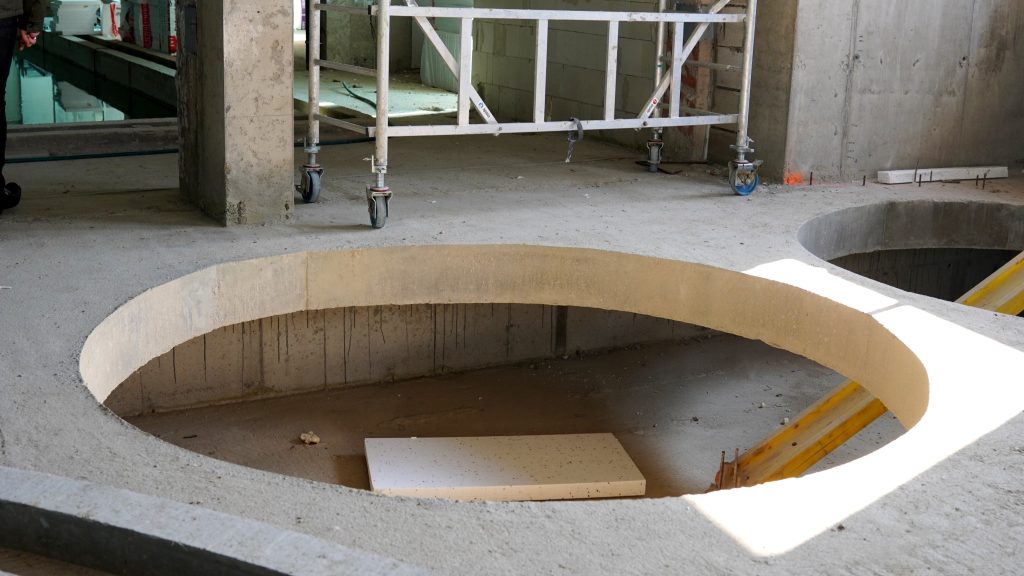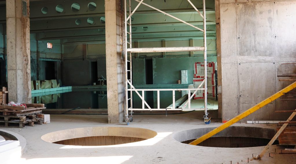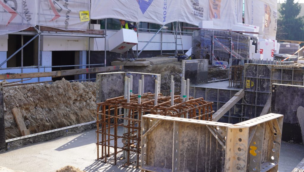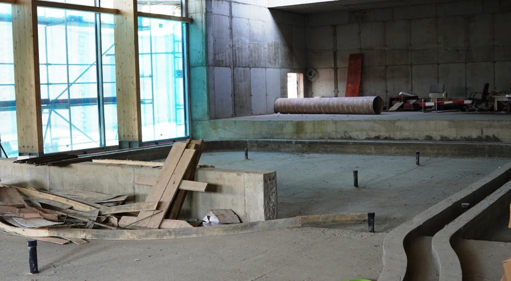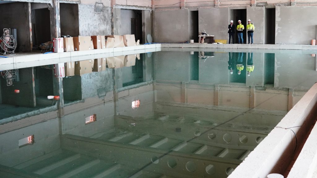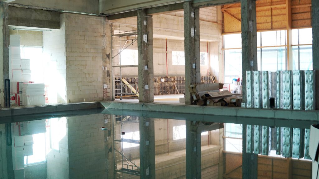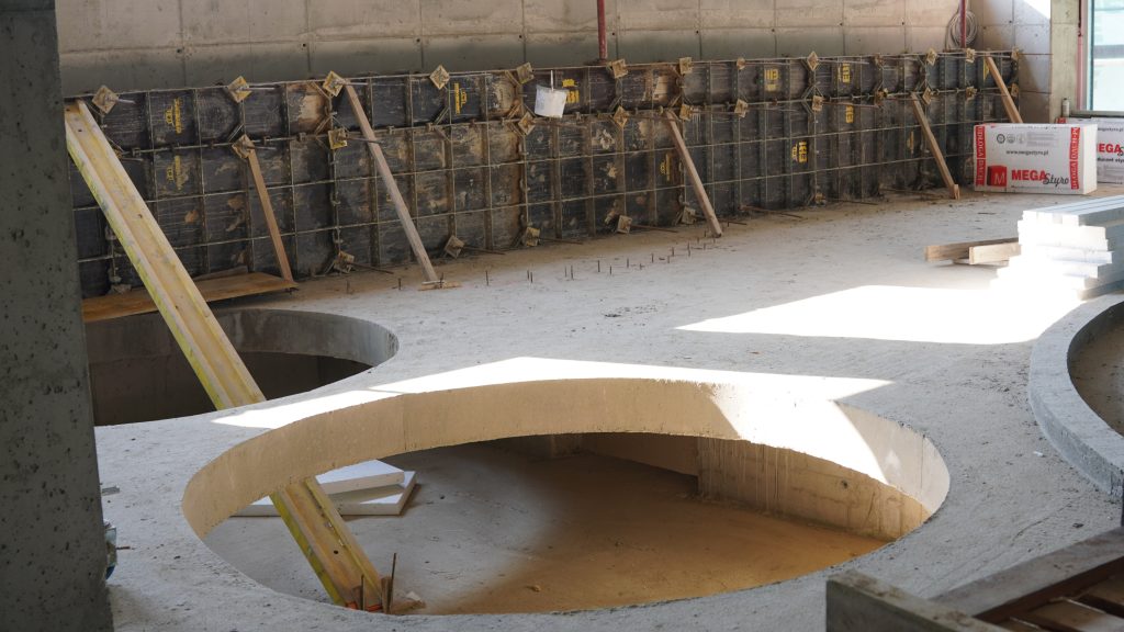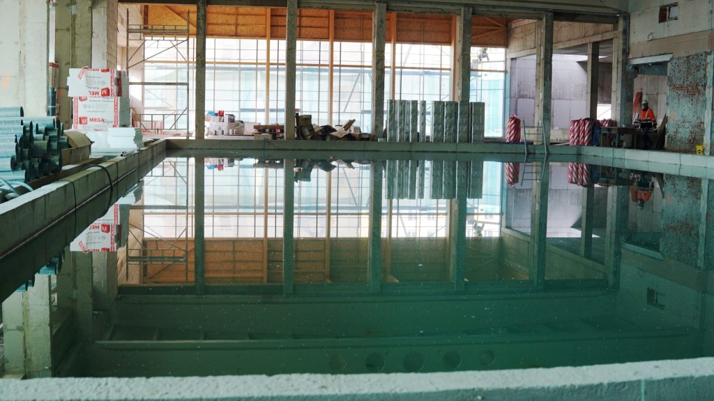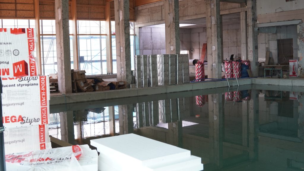 Obecnie na placu budowy prowadzone są testy szczelności nowej niecki basenowej. Równolegle trwają prace między innymi przy elewacji budynku oraz przy przygotowaniach do budowy podestu przeznaczonego pod dużą zjeżdżalnię.