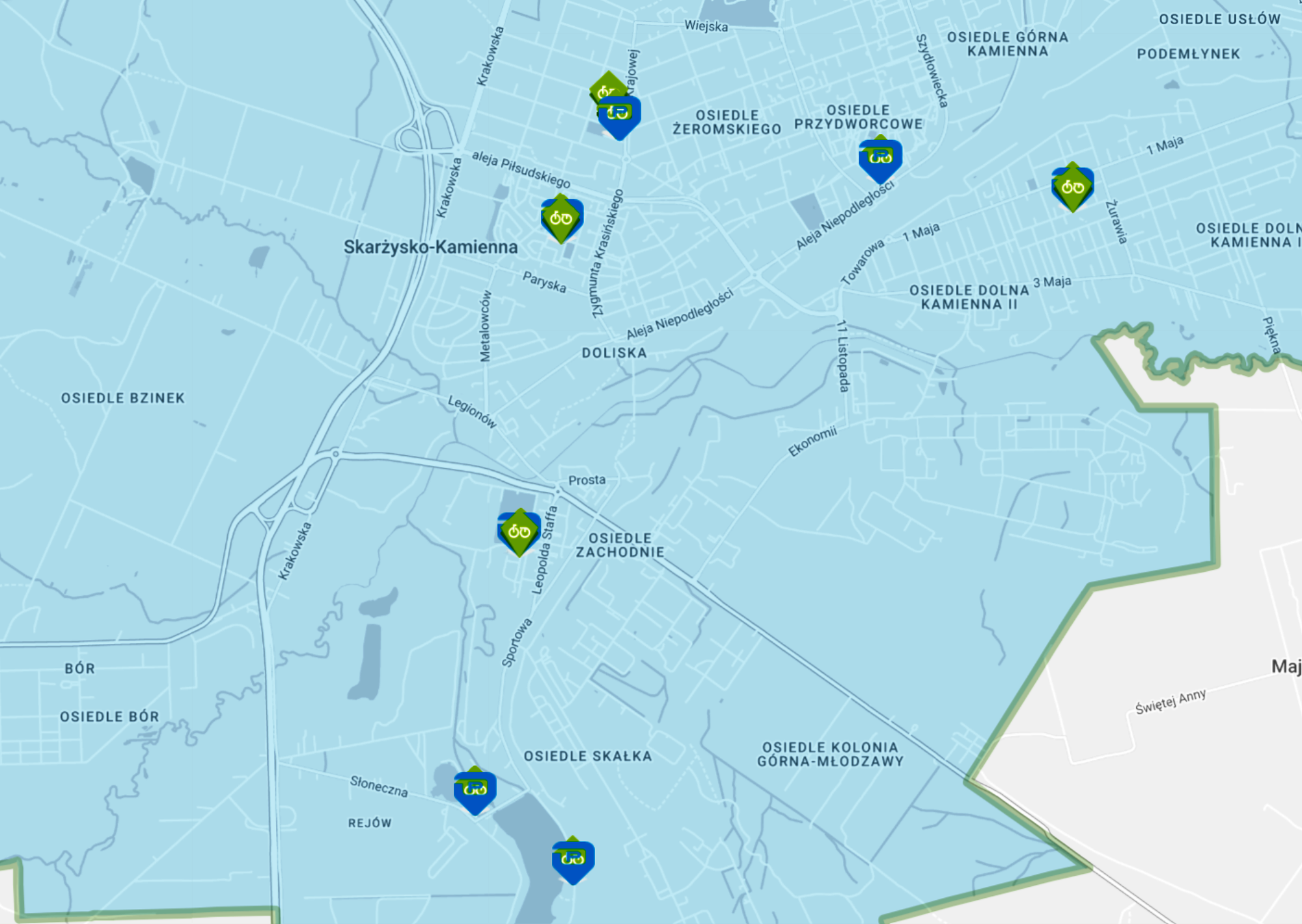 Rowery dostępne są w siedmiu lokalizacjach na terenie miasta – od Dworca PKP, przez centrum i osiedla, aż po Rejów. Stacje znajdują się: