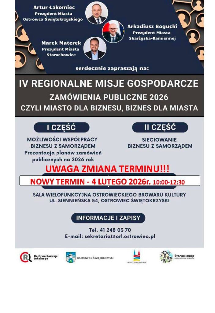 Podczas IV edycji Misji prezydenci miast: Artur Łakomiec – Prezydent Miasta Ostrowca Świętokrzyskiego, Marek Materek – Prezydent Starachowic oraz Arkadiusz Bogucki – Prezydent Skarżyska-Kamiennej, zaprezentują planowane na 2026 rok inwestycje, zakupy, usługi oraz roboty budowlane. To doskonała okazja, aby poznać nadchodzące postępowania i przygotować się do udziału w przetargach.