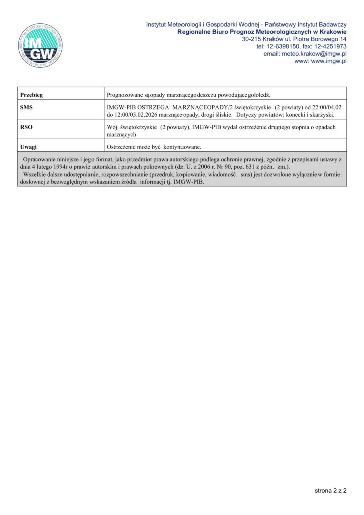Instytut Meteorologii i Gospodarki Wodnej – Państwowy Instytut Badawczy Regionalne Biuro Prognoz Meteorologicznych w Krakowie wydało ostrzeżenia meteorologiczne dla województwa świętokrzyskiego