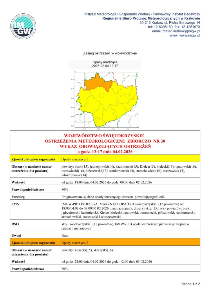 Instytut Meteorologii i Gospodarki Wodnej – Państwowy Instytut Badawczy Regionalne Biuro Prognoz Meteorologicznych w Krakowie wydało ostrzeżenia meteorologiczne dla województwa świętokrzyskiego